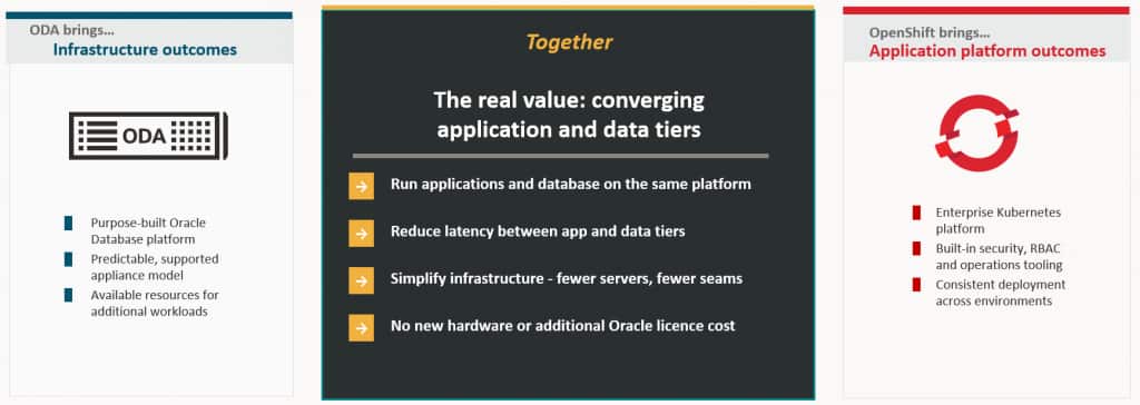 No new hardware required: OpenShift uses available system capacity on the ODA, including compute, memory, and storage resources already present in the appliance.
