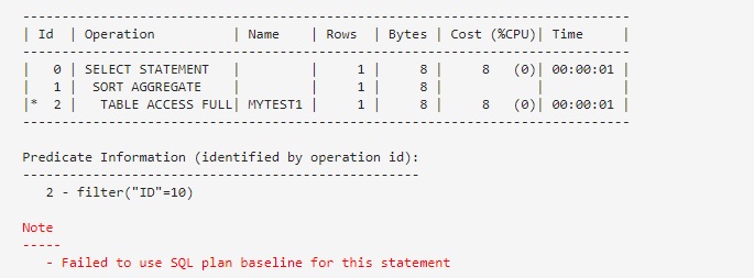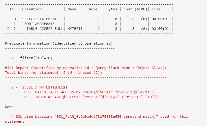 NOTE: If the optimizer chooses the same plan as the SQL plan baseline, and there are no other hints in the SQL statement, then no hint report will be produced. This is because the outline in the SQL plan baseline won’t need to be applied. In other words, if there is no hint report, then you know that the SQL plan baseline plan is being reproduced OK.