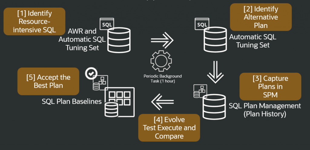 Automatic SQL plan management identifies SQL statements that are consuming significant system resources (by inspecting the AWR and SQL tuning sets). Historic performance information is used to establish whether there has been a likely performance regression. Perhaps application query Q1 has been completing in 1 minute for the past two years but today it takes 30 minutes. Alternate SQL execution plans are located automatically and test executed (using SPM evolution). The best plans are then enforced using SQL plan baselines without DBA intervention.