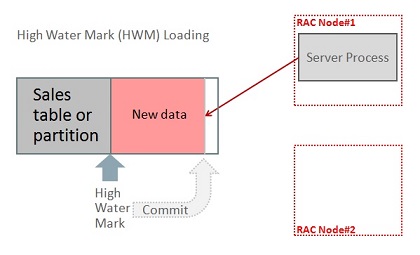 The following diagram represents a serial high water mark load on a 2-node RAC cluster. Rows are shown filling from left-to-right and on commit, the high water mark is moved up to the right to incorporate the new data: