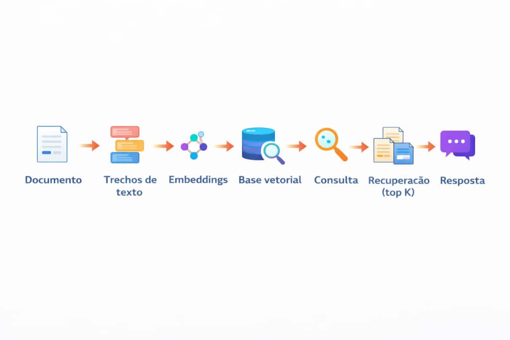 O conteúdo dos documentos é convertido para texto planoou para um formato mais palatável como o Markdown e, em seguida, dividido em pequenos fragmentos por meio de um processo de segmentação (chunking), normalmente com algum nível de sobreposição entre os fragmentos para preservar o contexto local. Cada fragmento é transformado em um vetor (embedding), que representa semanticamente aquele trecho. Esses vetores são armazenados em uma base vetorial (vector store), juntamente com estruturas otimizadas para busca, conhecidas como índices vetoriais. Esses índices permitem acelerar significativamente a recuperação por similaridade, evitando a comparação exaustiva com todos os vetores armazenados e viabilizando consultas eficientes mesmo em bases com grande volume de dados.