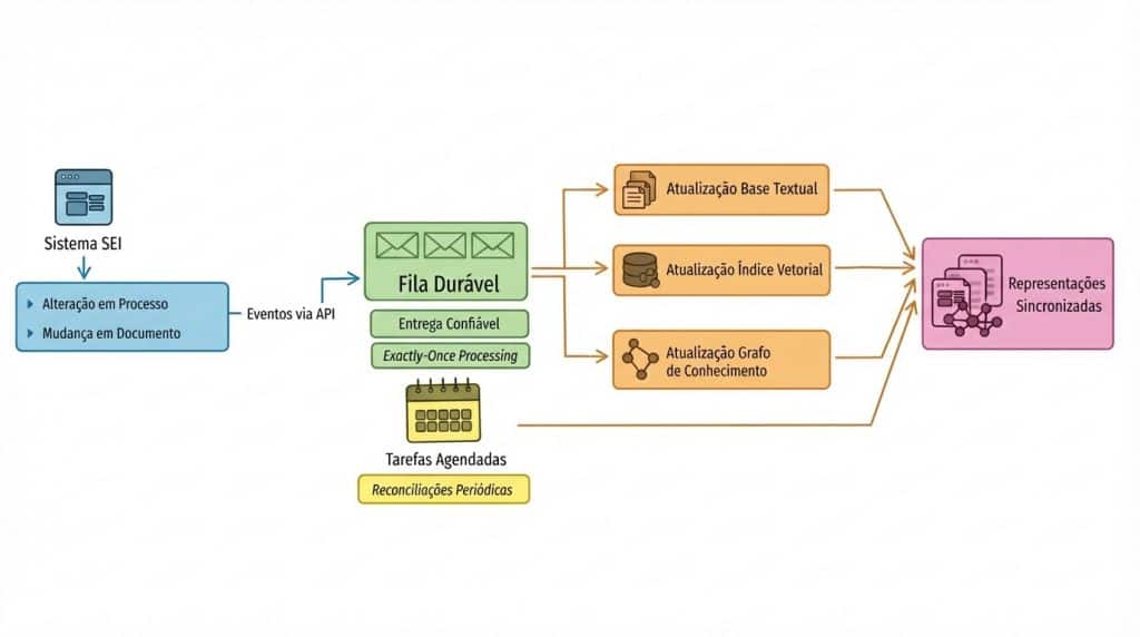Mudanças no sistema passam a gerar eventos que alimentam um fluxo de processamento responsável por atualizar tanto a base textual e vetorial quanto o grafo. A boa notícia é que o próprio SEI já disponibiliza uma API capaz de gerar eventos a partir de alterações em processos e documentos, o que facilita a implementação desse modelo.