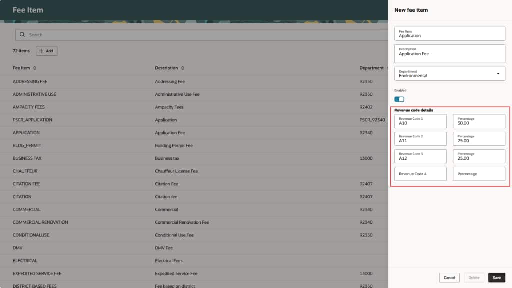 The Revenue Code Fields for Fee Percentage Allocation feature allows agencies to define up to four revenue codes per fee item, each with customizable percentage allocations.