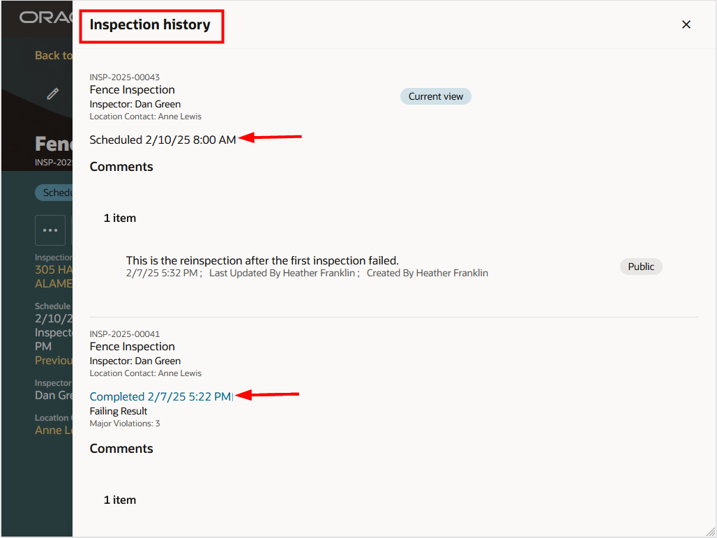 Only available in the Redwood Experience for the Inspector Application, this new functionality allows inspectors to quickly and easily identify which of their daily inspections are reinspections and to quickly access the inspection history.