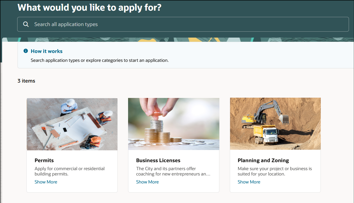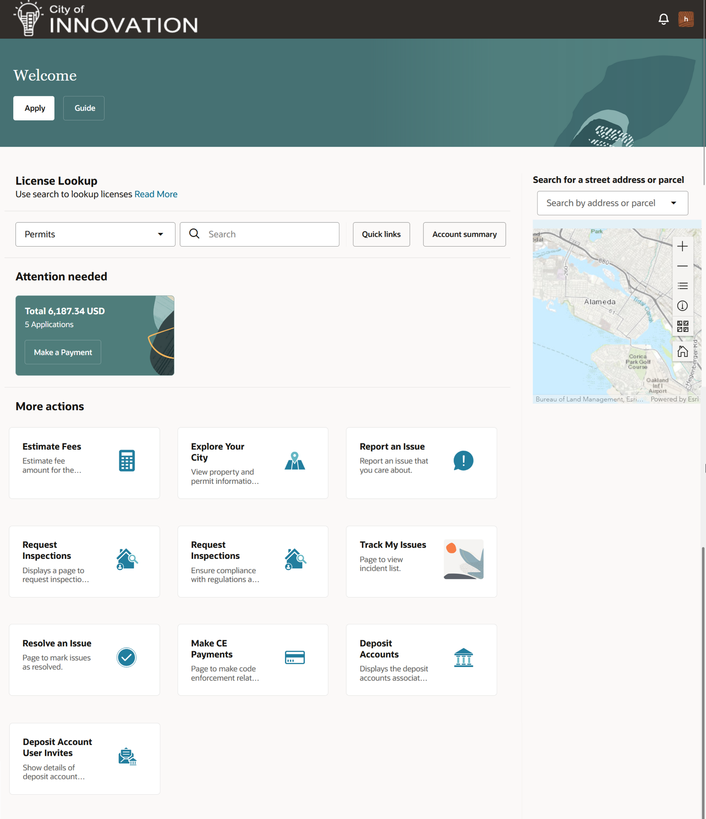 The new enhanced streamlined user experience is now available for the public user landing page for registered public users and anonymous (guest) users. The new landing page aligns with the look and feel of the Redwood Experience pages that have been delivered for various other areas in Permitting and Licensing.