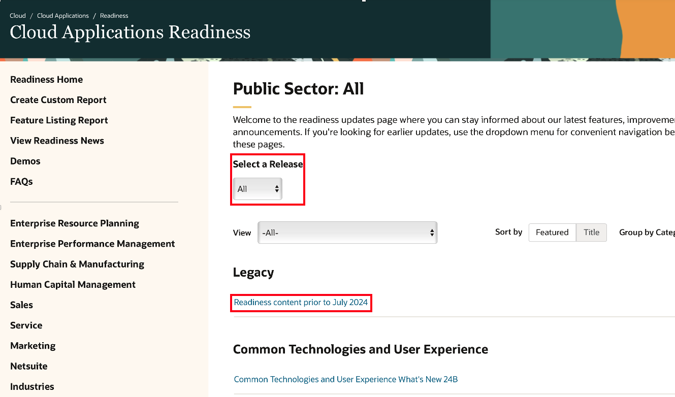 The Public Sector Cloud Applications Readiness page will display the most current readiness content. By selecting “All” in the Select a Release drop down you can see the latest releases. Additionally, you can access content prior to July 2024, by clicking the “Readiness content prior to July 2024”.