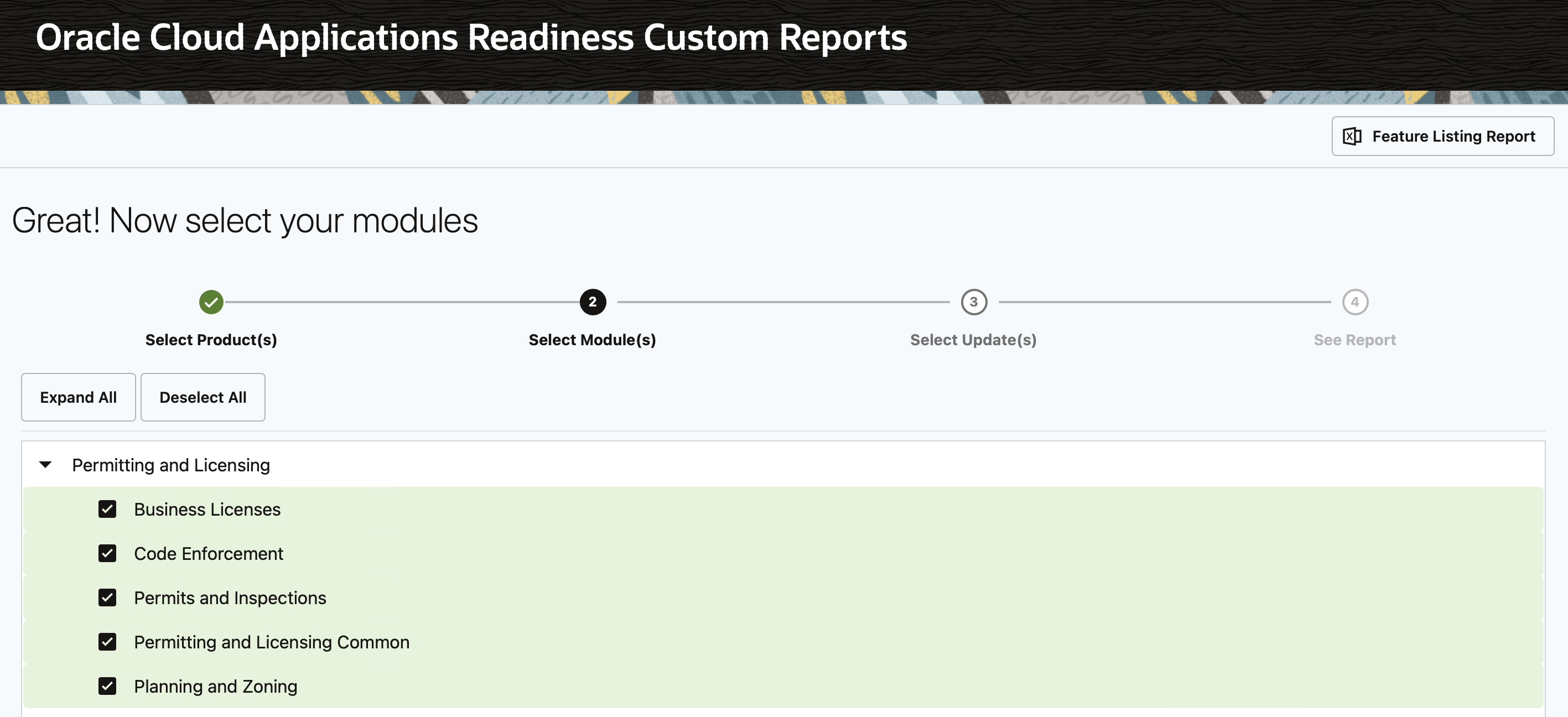 Select the modules and offerings you want to use to create your report. Note that “Permitting and Licensing Common” apply to all the offerings.