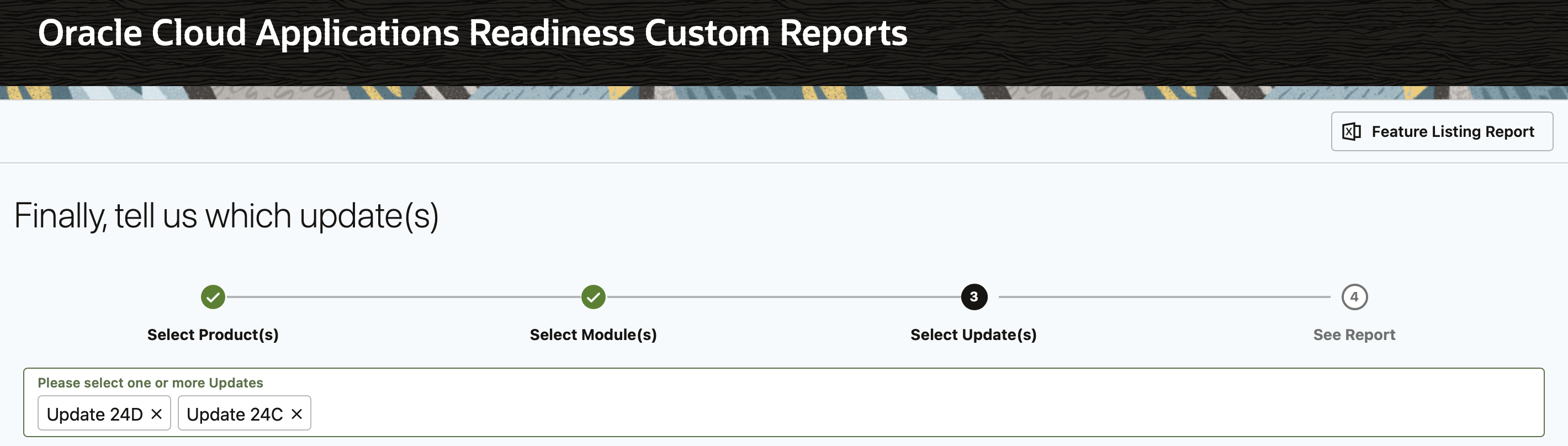 Click Select Update(s). Click in the search bar to select the update(s) that you want to populate your report.