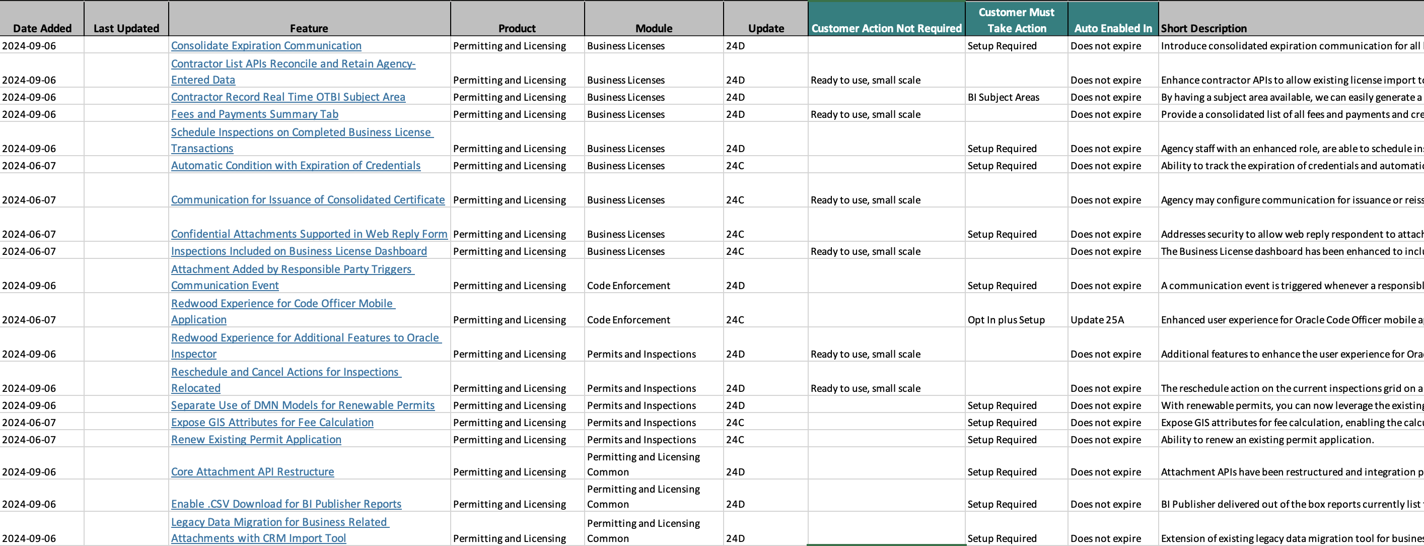 With the move to Oracle Help Center, you now have a convenient one-stop-shop for all your release readiness content. You can find the latest “What’s New” documentation, a collection of demos and spotlights, and the most recent online help all in one place. With quarterly releases for Oracle Permitting and Licensing this information is updated frequently. Be sure to bookmark the Oracle Help Center for easy access!