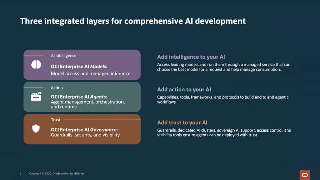 この新しいサービスは、AIインテリジェンス(モデルと推論)、それに基づいてアクションを実行する機能(エージェントとツール)、そして組み込みの制御機能(ガバナンスとセキュリティ)を、すべて1つのシンプルなソリューションに統合しています。チームがプロフェッショナル・コードを重視する場合でも、ローコード・ツールを好む場合でも、あるいはその両方を組み合わせている場合でも、OCI Enterprise AIは、柔軟性、拡張性、そして統一されたガバナンスにより、実験段階から本番環境への移行を支援します。