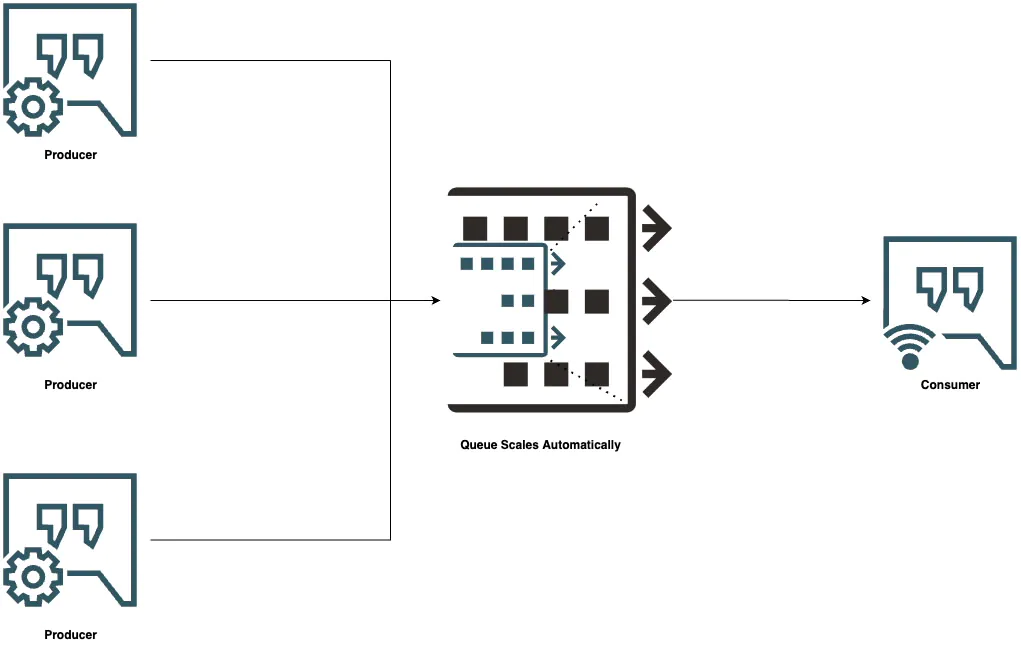 また、OCI Queue は、コンシューマが制限されている場合でも、短期間で大量のメッセージを取り込むことができ、コンシューマの可用性と帯域幅に従ってメッセージを処理できます。