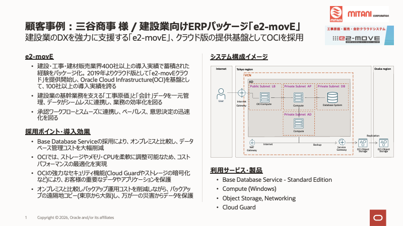 三谷商事様は、OCIの活用によるシステム運用負担の削減、堅牢なセキュリティ、柔軟なリソース設計など、さまざまな価値を享受することで、建設業界のDX推進を力強く支援しています。