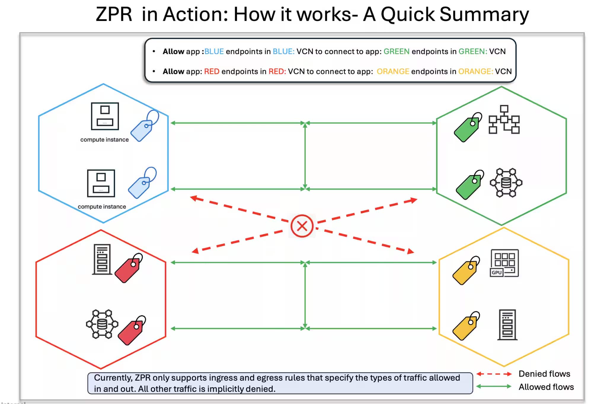 リソースが、Blue、Red、GreenおよびOrangeのラベルを持つZPRセキュリティ属性であるシナリオを想像してください。顧客は単に自分の意図を定義します。たとえば、Blueラベルが付いたリソースがGreenというラベルが付いたリソースと通信できるように指定し、Redラベルが付いたリソースがOrangeラベルの付いたリソースと通信できるように指定します。これらのセキュリティ属性は、VCNおよびVNICレベルで適用する必要があります。タグ付けが完了すると、定義したとおりに通信フローが実行されます。Blueタグ付きリソースはGreenタグ付きリソースと対話でき、Redタグ付きリソースはOrangeタグ付きリソースと対話できます。