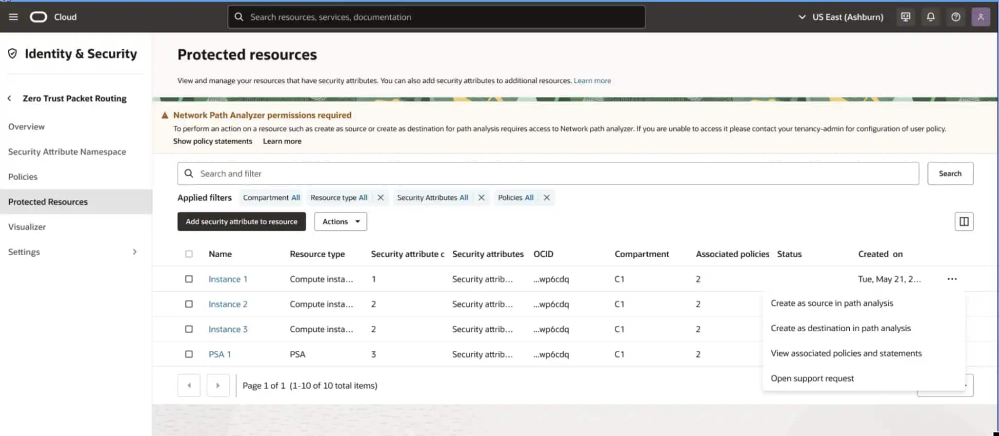 - ZPRコンソールへのアクセス: OCIコンソールにログインし、「ZPR Protected Resources」表に移動します。この表には、ZPRセキュリティ属性でタグ付けされたすべてのリソースがリストされます。
