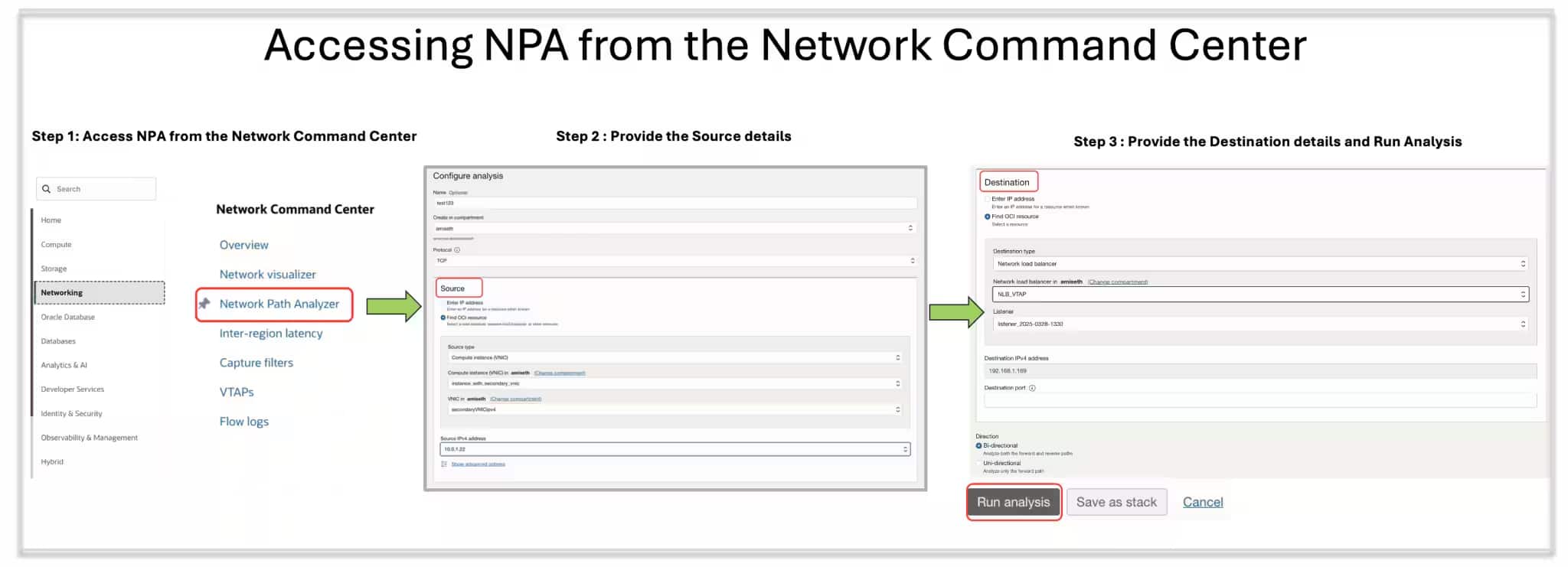 - NPAトラブルシューティングの開始: 「Troubleshoot with NPA」を選択し、ソース・エンドポイントと宛先エンドポイント(TCPポート443を介したOCIのネットワーク・ロード・バランサへのオンプレミスIP 10.251.1.163など)を指定します。