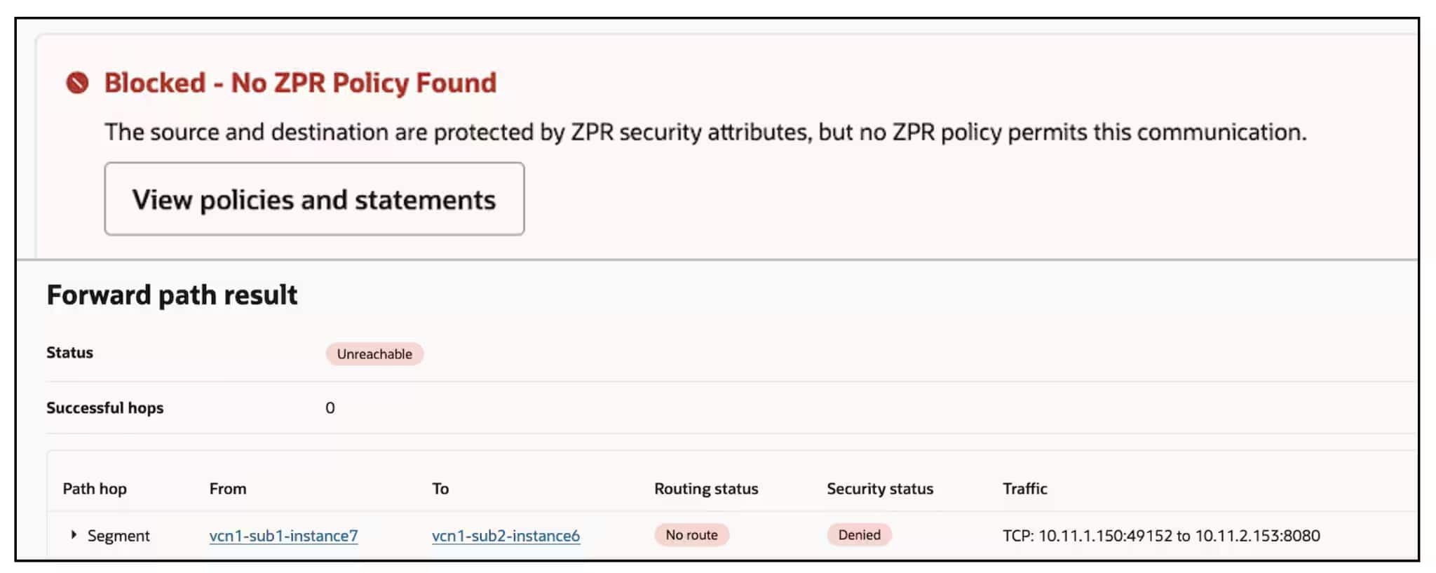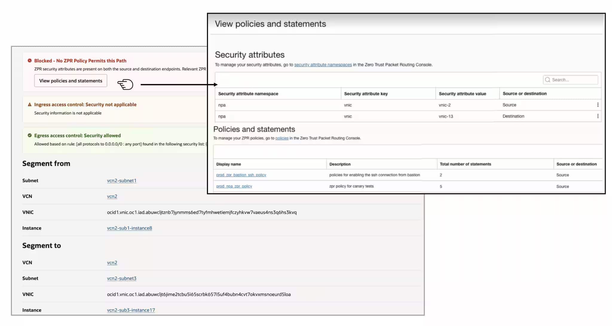 お客様がセキュリティ・ポリシーを構成および管理する方法を柔軟に理解できるように、当社は引き続きZPRとともにネットワーク・セキュリティ・グループ(NSG)とセキュリティ・リスト(SL)の両方をサポートしてきました。簡素化されたアプローチにZPRを採用するユーザーが増えるにつれ、ZPR、NSG、SLがすべてネットワーク内に存在する共存期間が期待されます。また、ネットワーク接続の問題のトラブルシューティングは複雑であることも認識しています。ユーザーは、ルーティング、ZPR、NSG、セキュリティ・リスト・ポリシーの欠落または構成ミスによる問題を迅速に特定する必要があります。オラクルのネットワーク・パス・アナライザ(NPA)ツールでは現在、トラブルシューティングを支援するためにルーティング、NSGおよびセキュリティ・リスト・ポリシーを可視化しています。現在、NPAを拡張してZPRポリシーを可視化し、より包括的で効率的なトラブルシューティング体験を実現しています。