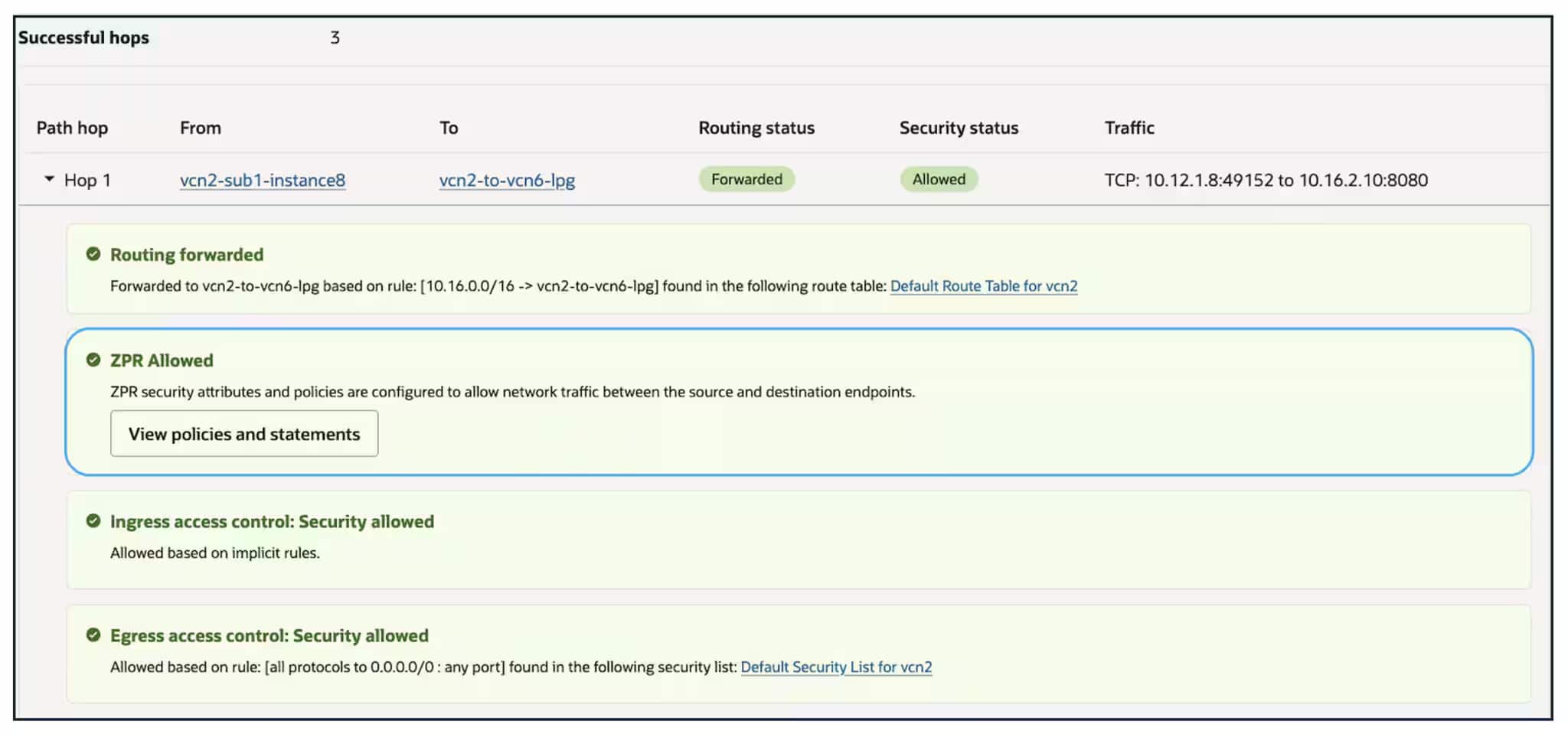 このシナリオでは、ユーザーはZPRセキュリティ・ポリシーおよび属性に関連するすべての問題を正常に解決し、すべてが期待どおりに機能しています。NPAは、選択したソースと宛先の間のパス全体のホップバイホップ・トレースを提供し、各ホップで適用可能なルーティングおよびセキュリティ・ポリシーを可視化します。必要に応じて、ユーザーはトポロジ内の各ホップをクリックして、その時点で使用されている特定のルーティングまたはセキュリティ・ポリシー(SL、NSGおよびZPR)を表示できます。