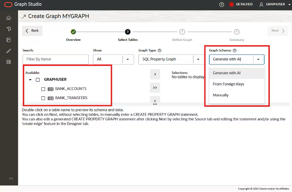 Oracle Graph Studioのグラフ・モデラーに新たに追加された生成AIオプションにより、チームは複雑なスキーマを解読したりグラフSQLを書いたりすることなく、リレーショナル表から実用的なグラフ定義へと数分で移行できるようになります。ユーザーが選択した表から自動的にグラフ定義を提案し、簡単に調整できるため、Graph Studioは初心者と専門家の双方がグラフ活用の取り組みを加速し、関係性に基づく洞察をより迅速に発見できるよう支援します。