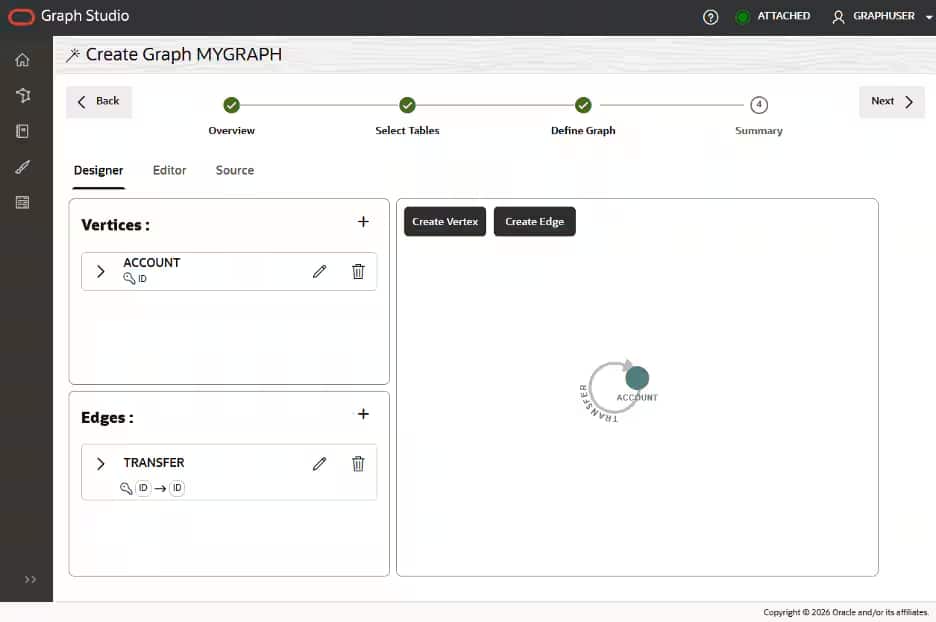 次に、使用したいSELECT AIプロファイルを選択すると、グラフ定義が作成されます (図4)。必要に応じて、頂点やエッジを追加したり、「Source」で定義を編集したりすることもできます。