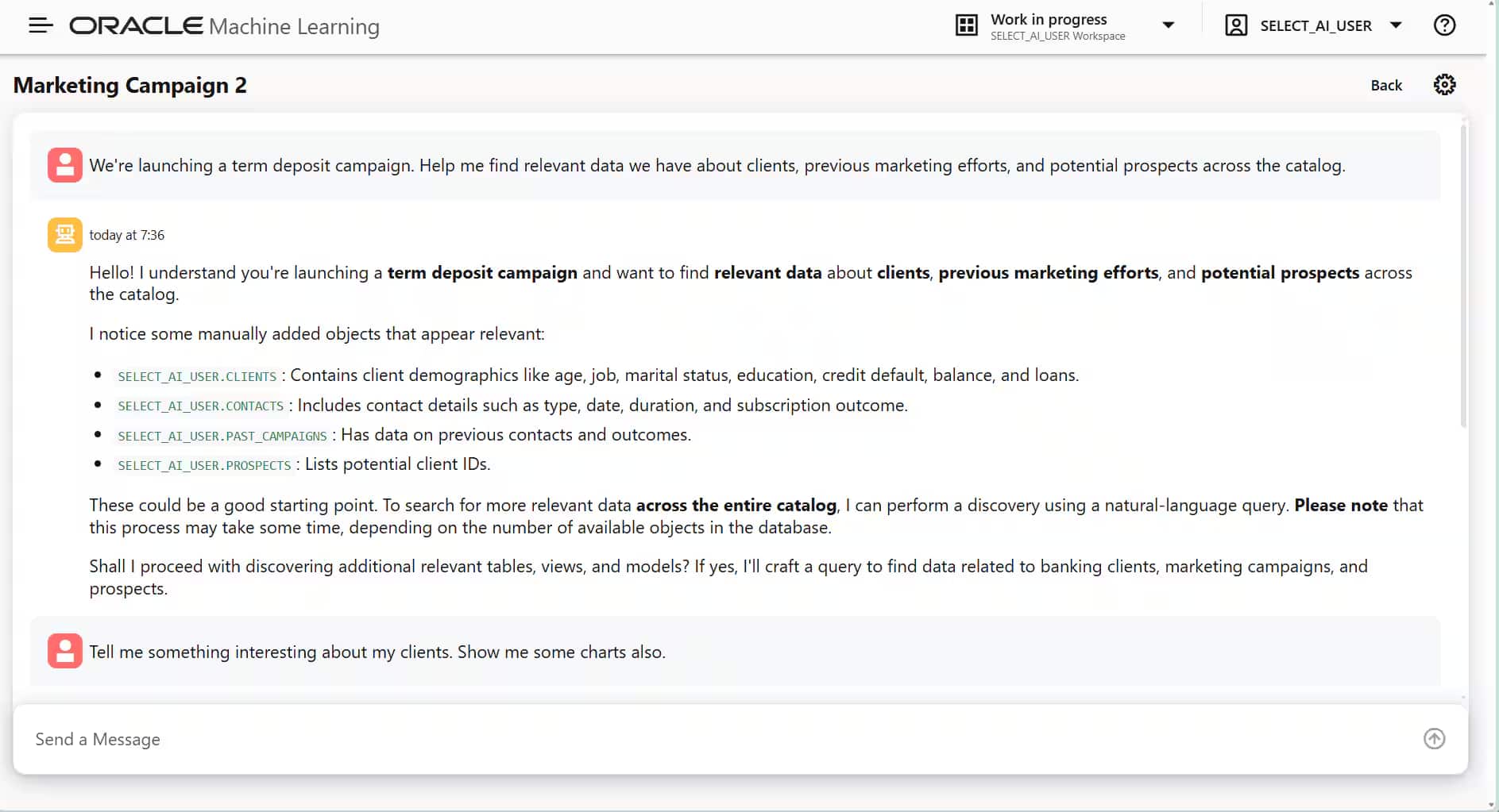 たとえば、次のようなプロンプトから開始できます。「定期預金キャンペーン期間を開始します。顧客、過去のマーケティング施策、および潜在的な見込み客に関して、カタログ全体から関連データを見つけるのを手伝ってください。」