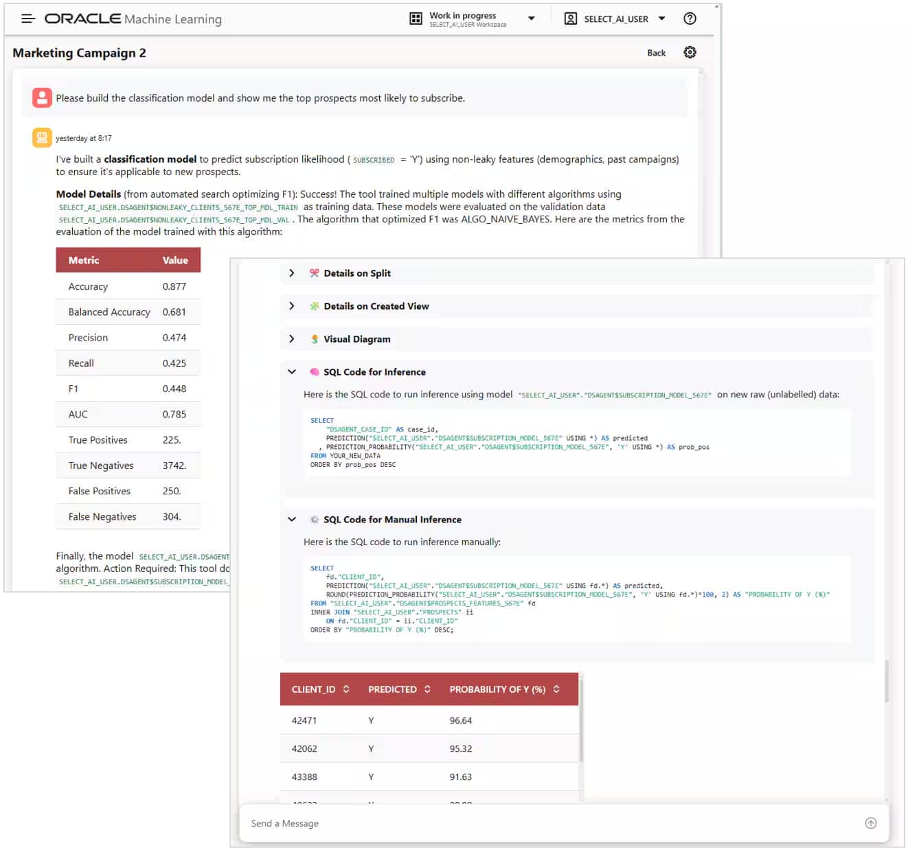 その後、分類モデルの構築と、例えばサブスクライブ(購読)する可能性が最も高い有望顧客 (プロスペクト)の上位を表示するよう依頼します。Data Science Agentは、データベース内でモデルを構築するだけでなく、図3に示されているように、精度 (accuracy)や混同行列 (confusion matrix)といった評価指標も表示します。さらに、推論に使用できるSQLの例や、購読確率の高い順に並べられた顧客IDの一覧などを提示して、リクエストを完了します。