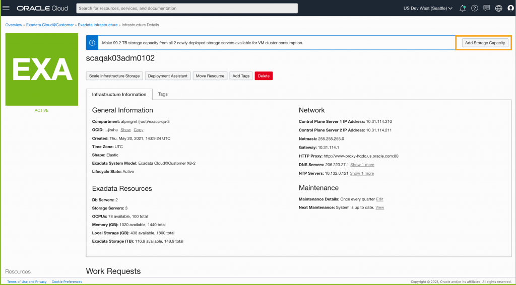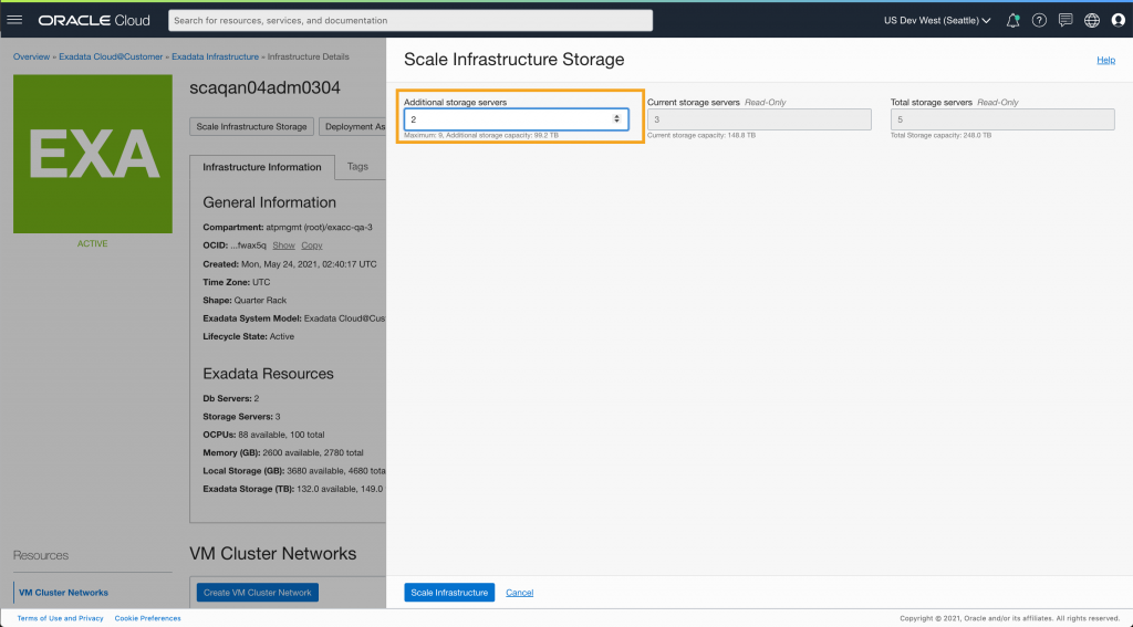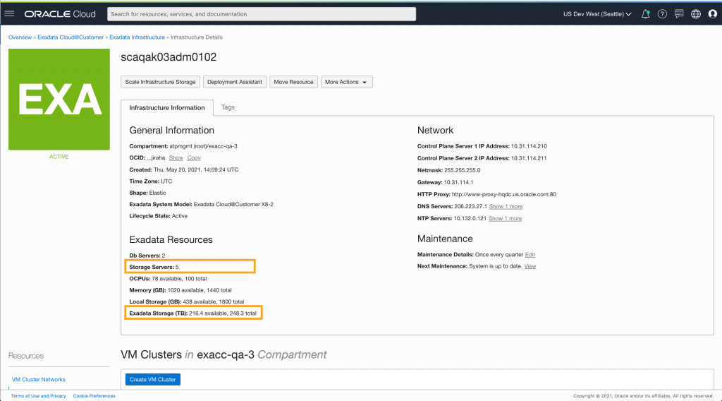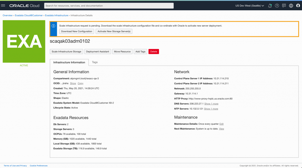 エラスティック構成でのストレージ拡張のためのこれらすべてのステップを完了すると、インフラストラクチャの詳細ページでストレージサーバーの総台数とExadata共有ストレージの総容量を確認できます。