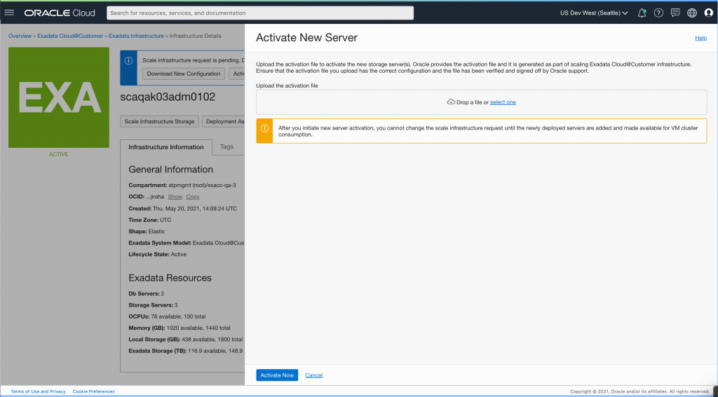 オラクルのフィールドエンジニアリングチームは、お客様と協力して、スケールリクエストが開始されたExadataインフラストラクチャの一部として、リクエストされた数の追加のストレージサーバーが確実にデプロイされるようにします。追加のストレージサーバーをデプロイした後、オラクルは新しいサーバーをアップロードしてアクティブ化するための構成ファイルを提供します。