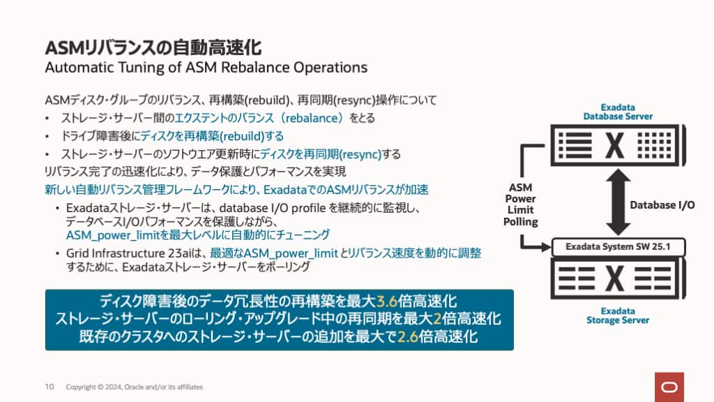 さまざまなシナリオにおけるリバランス管理は、もはや手動でのトレードオフ調整を必要としません。Exadata System Software 25.1の自律機能により、システムはリアルタイムのワークロード需要に基づいてリバランス操作を自己調整できるようになりました。これにより、データ再分散はデータベースSLAを保護しつつ可能な限り迅速に完了し、その性能向上は上図にも明確に示されています。Oracle Exadataの自動リバランスメカニズムは、データ移動経路を最適化することで、手動介入を大きく上回る性能を発揮します。主要な性能ベンチマークとして、ディスク障害後にフル冗長へ戻るまでが3.6倍高速化、メンテナンスウィンドウ中の再同期(resync)操作が2倍高速化、さらに新しいストレージノードを追加してインフラをスケールアウトする際の再分散効率が2.6倍向上しています。