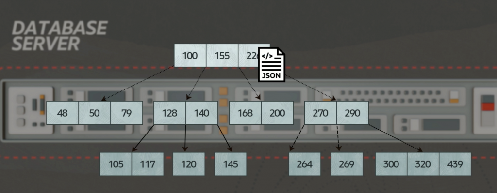 この画像は、データベースサーバーのメモリ内のインデックスツリーと、そのインデックスツリーへの新しいオブジェクトまたはデータ行の挿入に関連する処理を示しています。 ツリーの大部分はメモリに収まりますが、データが大きすぎてメモリに収まらないことが多く、ストレージから読み取る必要があります。