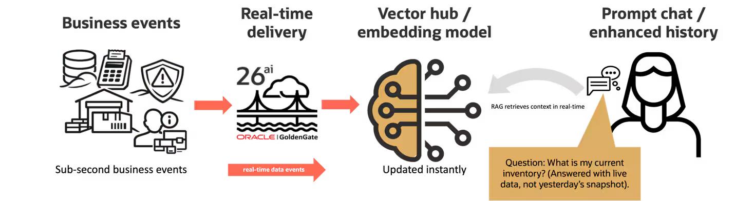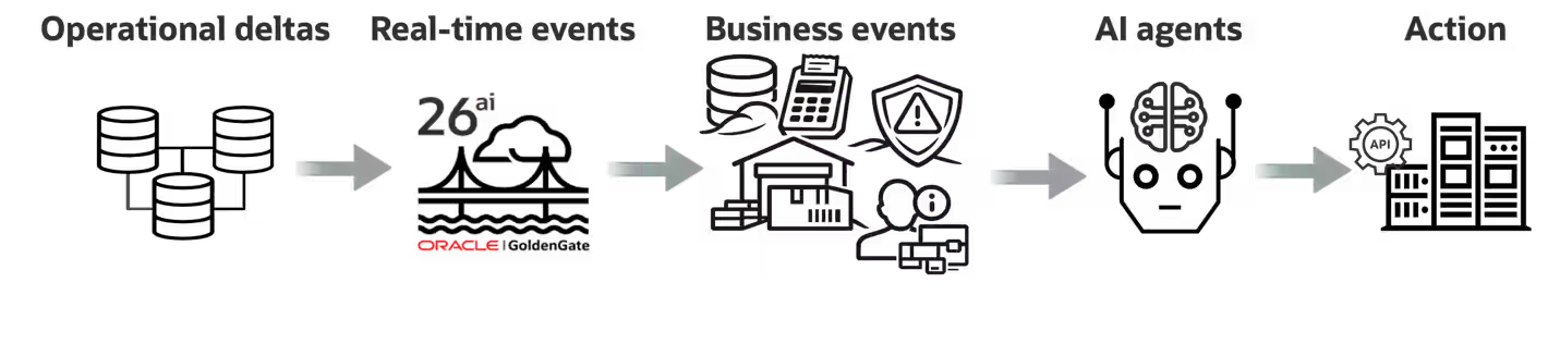 GoldenGate 26aiは、Oracleのリアルタイム・データ移動プラットフォームであり、オンプレミス、OCI、マルチクラウド環境にまたがる異種システムやロケーション間でのビジネス・イベントの変化を統合するよう設計されています。エージェント型アーキテクチャにおける戦略的価値はシンプルです。時間の経ったレプリカや脆弱なパイプラインに依存することなく、運用上の変化を発生と同時に把握できるとき、エージェントの有用性は飛躍的に高まります。