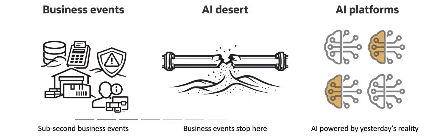 多くの企業はいまだに、バッチ処理のパイプライン、スケジュールされたジョブ、そして寄せ集めの統合によって、運用データを分析基盤やAIプラットフォームに提供しています。AIレイヤー自体が高度であっても、その多くは現実より遅れた履歴スナップショットに基づいているのが実情です。