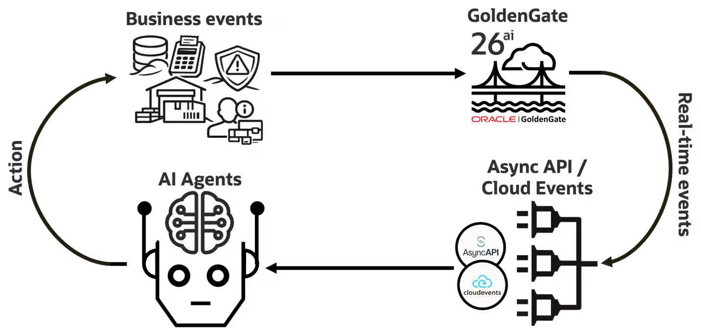リアクティブなエージェントはイベント・ループに従って動作し、GoldenGate Data StreamsはCloudEventsおよびAsyncAPIを通じてビジネス・イベントを提供
