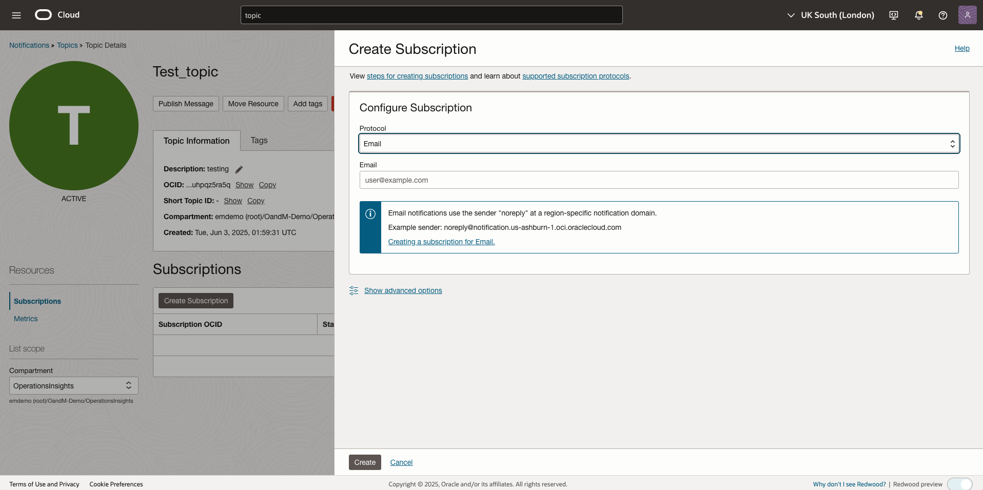 アラーム構成の別の属性は、トリガーしきい値が満たされた後のアラートの宛先です。既存の「トピック」を作成または使用して、起動状態に達したときに通知を送信できます。使用可能なエンドポイントのいくつかは、電子メール・アドレス、Slackチャネル、SMSおよびカスタムURLです。ユーザーは、重要なメッセージを素早く処理するために受信できます。