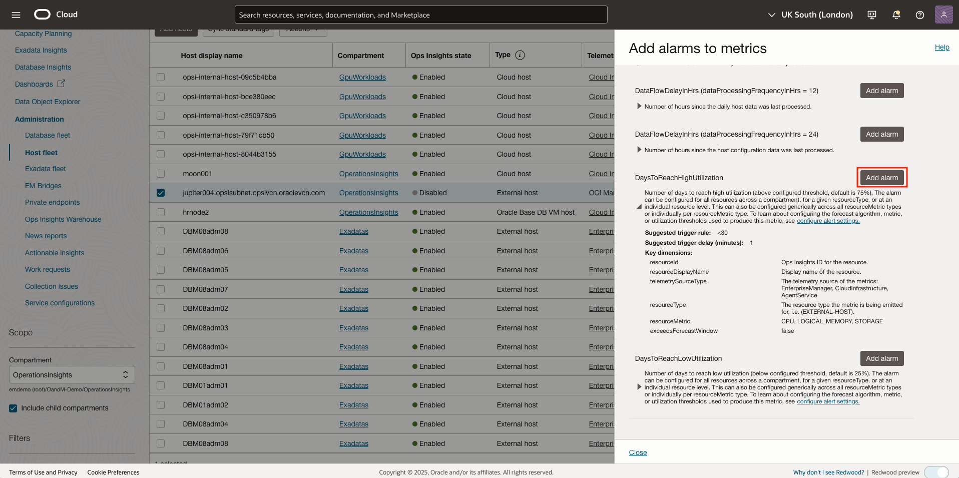 多くの管理者は、コマンドライン・コマンドを手動で入力するか、独自のカスタム・スクリプトを作成して、環境が予想どおりに実行されているかどうかを確認し、多くのリソースが使用可能であることを確認します。Operations Insightsで新しく実装されたアラーム機能では、カスタム・リソース・アラーム構成を実行して、このような繰返しの手動作業を減らし、管理者に戻すことができます。