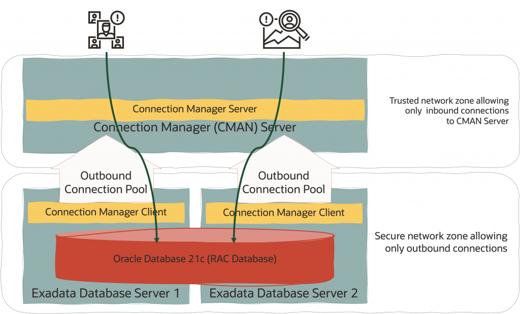 Connection Manager(CMAN)に入ります。 Oracle Database 21cでは、CMANを使用して、アプリケーションからのインバウンド接続が送信されるCMANサーバーとデータベースサーバーで実行されているCMANクライアントの間にセキュアトンネル(sshトンネルと考えてください)を作成できます。次の図は、信頼できるネットワーク内のCMANサーバーへの安全なコネクション・プールを作成したExadata Database Server上のCMANクライアントを示しています。クライアントとアプリケーションは、信頼されたゾーンのCMANサーバーに接続し、CMANサーバーは、安全なトンネルを使用してクライアントをデータベースに接続します。非常にシンプルです!