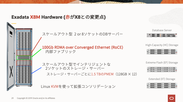 Exadata X8Mには、プラットフォームの最新のパフォーマンスの向上を推進する3つの大きな変更があります。これらの変更は、以下の赤で強調表示されています。