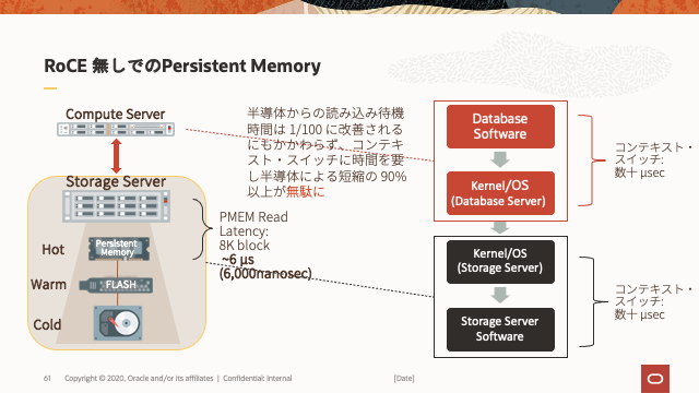 永続メモリーのパフォーマンスは、マイクロ秒、さらにはナノ秒で測定されるようになりました。これは、I/Oスタックの他の部分がはるかに重要になったことを意味します。コンバージド・イーサネット・ファブリック全体のRDMAにより、Exadataは永続メモリーのパフォーマンスを最大限に活用できます。これを説明する最良の方法は、永続メモリーがRoCEなしでExadataに導入された場合に何が起こるかを調べることです。