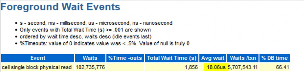 RoCEとPMEMの組み合わせにより、他のストレージソリューションよりも劇的に高速な応答時間と、はるかに高いIOPS(1秒あたりの入出力操作)が実現します。ExadataでのPMEMのこの最初のリリースでは、卓越したパフォーマンスが最大のメリット領域に焦点を当てています。これは、最高のIOPSをもたらすデータベース操作です。シングルブロック読み取り(single block read)は、Oracle Databaseで最も高いIOPSイベントです。これは、Exadataでは「セル単一ブロックの物理読み取り(cell single block physical read)」と見なされます。これは、Exadata以外のシステムでの「dbファイルの順次読み取り(db file sequential read)」に相当します。次のAWR(自動ワークロードリポジトリ)レポートのスクリーンショットは、これが実際に動作していることを示しています。