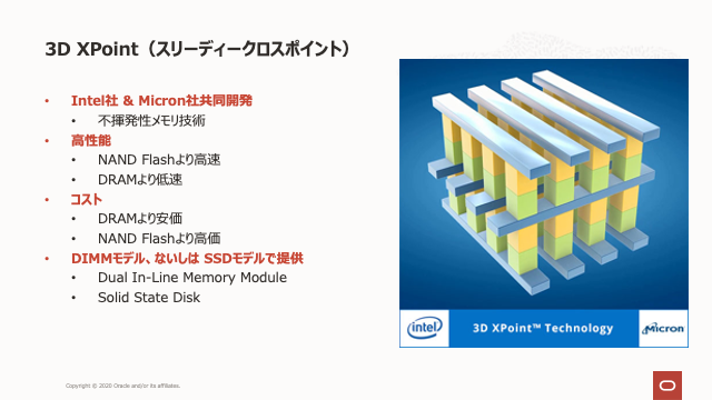 3D XPointはNANDフラッシュより高速ですが、DRAMより低速です。3D XPointは、フラッシュよりも(容量で)高価ですが、DRAMよりも安価です。コストと速度のこれら2つの要因により、3D XPointはフラッシュとDRAMの間に配置されます。3D XPoint以外の他の不揮発性(NV)メモリー・テクノロジをサポートする、永続メモリーのAPIおよびプログラミング標準のセットもあります。永続メモリーのドキュメントはhttp://pmem.ioで公開されています。
