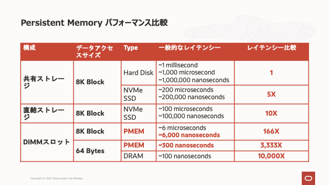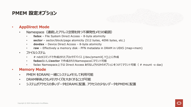 この記事の執筆時点でのOracle Databaseの現在のすべてのバージョンは、このMy Oracle Support Noteで概説されているように、これらの構成で破損する可能性があります。( File Systems and Devices on Persistent Memory (PMEM) in Database Servers May Cause Database Corruption (Doc ID 2608116.1 ) このドキュメントの根底にある問題は、Memory Mode またはSSD・フォーム・ファクタで動作する永続メモリーには適用されません。