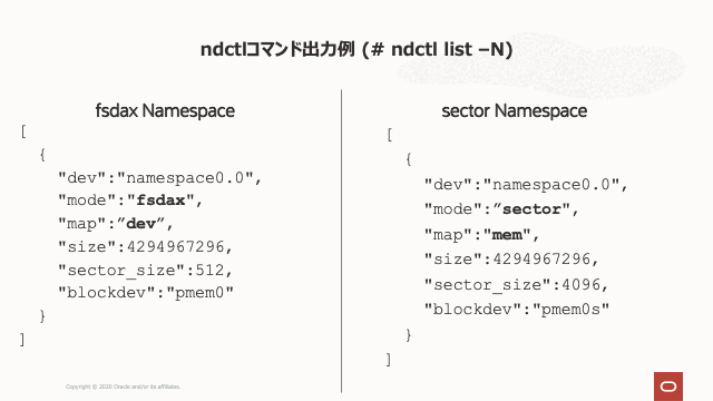 ndctlユーティリティは、Linuxプラットフォームで不揮発性メモリ−・デバイスを構成するために使用されます。コマンド”ndctllist -N”は、構成されたNamespaceのリストを表示します。次の図は、fsdaxとセクターの名前空間とそれらの構成の詳細を示しています。