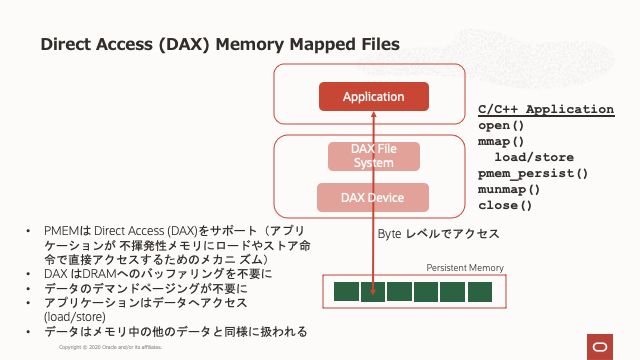 メモリは基本的にバイト指向であり、永続メモリー (Intel Optane DC Persistent Memory) は、アプリケーションがバイト指向で使用するように設計されています。アプリケーションは、アプリケーションによってDRAMに配置されたデータと同じように、永続メモリを使用してデータに直接(インプレースで)アクセスできます。LinuxのC/C++関数mmap()は、永続メモリ内のファイルをアプリケーションのアドレス空間にマップします。次の図に示すように、ファイルシステムがDAXオプション ( mount -o dax ) を使用してマウントされている場合、システム・バッファーは削除され、アプリケーションは永続メモリにあるデータを直接操作します。