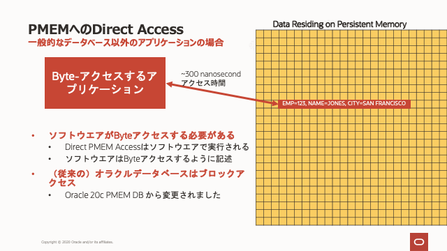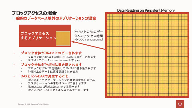 この図では、ブロック全体がPMEMからDRAMに読み込まれています。これは、READの観点からはフラッシュSSDまたは回転ディスクと機能的に同じです。ただし、データの書き込みは、ブロック指向のアプリケーションにビッグデータの整合性に影響を及ぼします。もちろん、データベースは伝統的にブロック指向であり、これは確かにOracleデータベースに当てはまります。