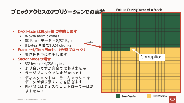 永続メモリー(Intel Optane DC Persistent Memoryなど)は、従来のストレージのようにデータのブロックではなく、バイトごとにネイティブに動作します。データは、最大で8バイトのチャンクで永続メモリーに永続化されます(ここでも、デフォルトの動作を使用します)。ブロック構造に基づくアプリケーション(データベースなど)の場合、永続メモリの8バイトのアトミック性が問題になる可能性があります。8,192バイトのデータ(8Kブロック)の書き込みは、それぞれ8バイトの1,024チャンクで永続化されます。電源障害またはその他の異常な状態により、データのブロックが「壊れた(fractured)」または「破れた(torn)」状態になり、ブロックの一部に古いデータが含まれ、他の部分に新しいデータが含まれる可能性があります。この種のブロックの破砕や破損に耐えられるように、アプリケーション(データベースなど)を変更する必要があります。それ以外の場合、これらは事実上破損したデータブロックです。