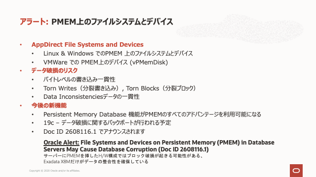 Oracle Databaseの今後の機能は、PMEMのパフォーマンス上の利点を最大限に活用するとともに、上記のデータ破損の問題に対処します。さらに、Oracle Database 19cへの今後のバックポートでは、このMOS Note 2608116.1 の主題であるデータ破損の問題に対処します。このデータ破損の問題に対する既知のファイルシステム、デバイスドライバー、またはその他の解決策はありません。