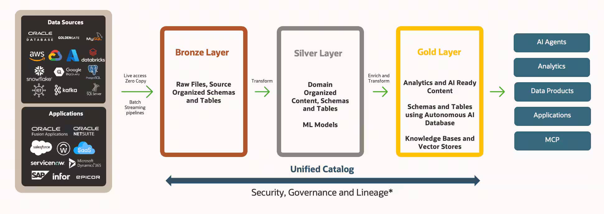 AI Data Platformは、メダリオン・アーキテクチャ (Bronze、Silver、Goldの各レイヤー) を採用してデータを整理します。これにより、取り込んだままのローデータから、アナリティクスやAIに即時利用可能なデータ資産へと、構造化された精製プロセスを確実に実行します。この階層化アプローチは、Unified Catalog (統合カタログ) によって完全に統制されます。Goldレイヤーまで処理されたデータプロダクトは、Oracle Analytics Cloudやその他の可視化ツールを通じて、高度な分析に活用することが可能です。