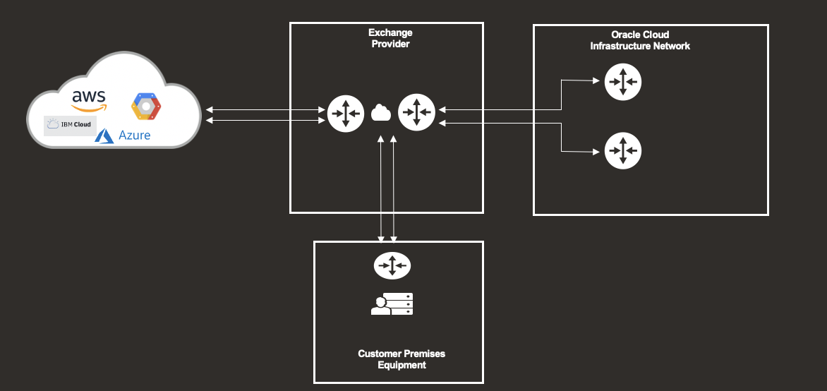 すべてのクラウド・プロバイダーが提供する主なサービスは、ネットワーク(場合によってはエクスチェンジ・プロバイダーも含む)を介したプライベートWAN接続です。これらのプライベート接続は、クラウド・サービスやクラウド・アプリケーションへの直接接続を提供します。これらの接続は、プロバイダーのクラウド・データ・センターへのレイヤー2 イーサネット、レイヤー3 MPLS、またはIPVPN接続が主体となっています。エンタープライズグレードのクラウド環境で作業する場合、クラウド・リソースへの低遅延かつ高可用性のネットワーク接続を提供するために、これらの直接接続が必要になります。このようなサービスの例としては、Oracle Cloud Infrastructure FastConnect、Microsoft ExpressRoute、AWS Direct Connectなどがあります。