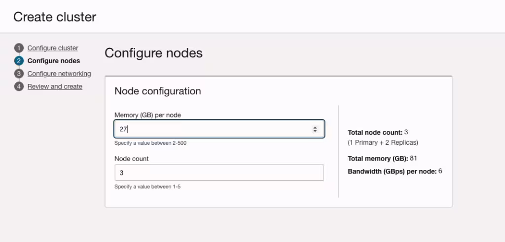 柔軟なメモリシェイプ: OCI Cache with Redisはメモリに関して完全な柔軟性を提供するため、アプリケーションのニーズに最適なものを選択できます。 単一ノード上の小規模な 2 GB クラスタから、最大9つのノードによる大規模な500 GBクラスタまで。