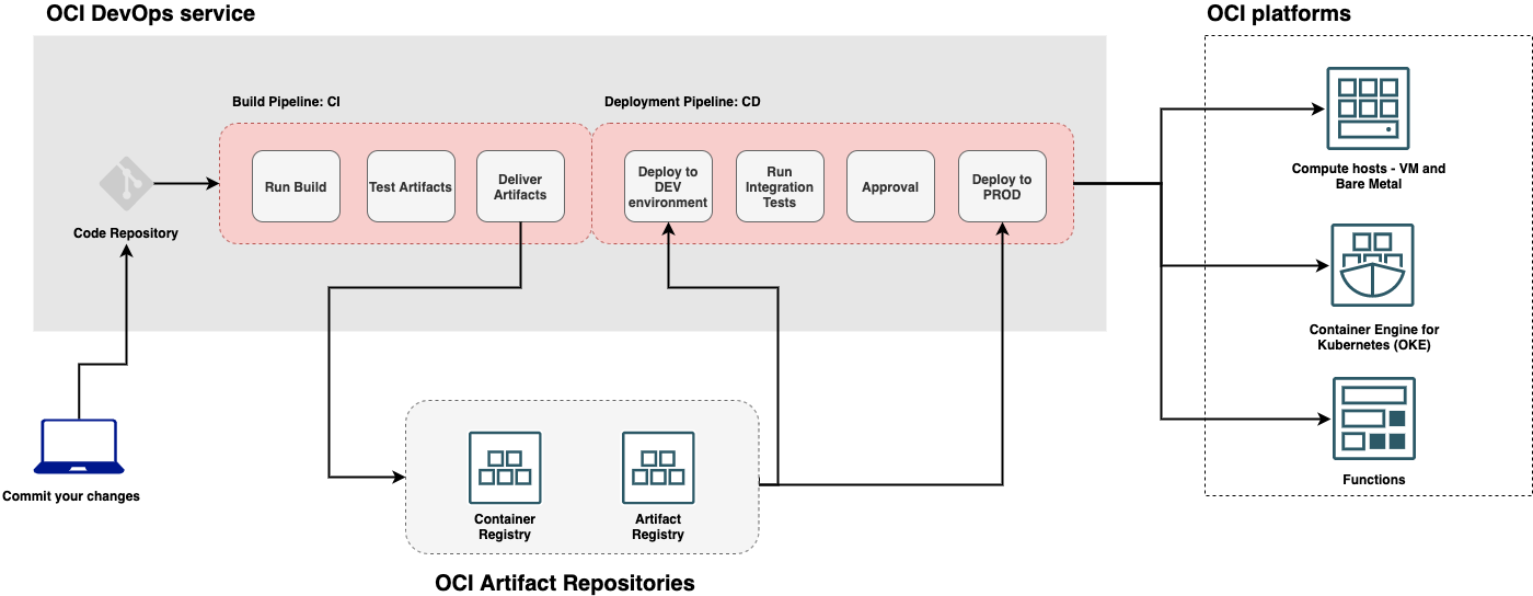 Oracle Cloud Infrastructure(OCI)DevOpsサービスの継続的インテグレーション(CI)機能が一般提供されたことをお知らせします。 このリリースは、既存の継続的デプロイ(CD)機能に加えて構成され、OCI商用提供リージョンにて、完全なend-to-endのCI/CDプラットフォームを提供します。開発者は、ソースコードをDevOpsコード・リポジトリにコミットし、build runnerを使用してソフトウェアのアーティファクト(成果物)をビルド、テストし、成果物(アーティファクト)をOCI Repositoriesに保存してから、OCIのプラットフォームへのデプロイを実行できるようになりました。