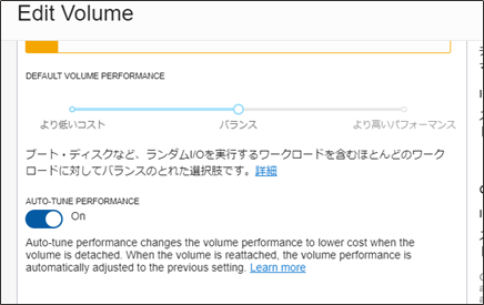 • ボリュームに対して自動チューニングをONにすると、インスタンスにアタッチされている時は選択したデフォルトのパフォーマンスタイプに、デタッチされている時はLower Costに自動調整されます。